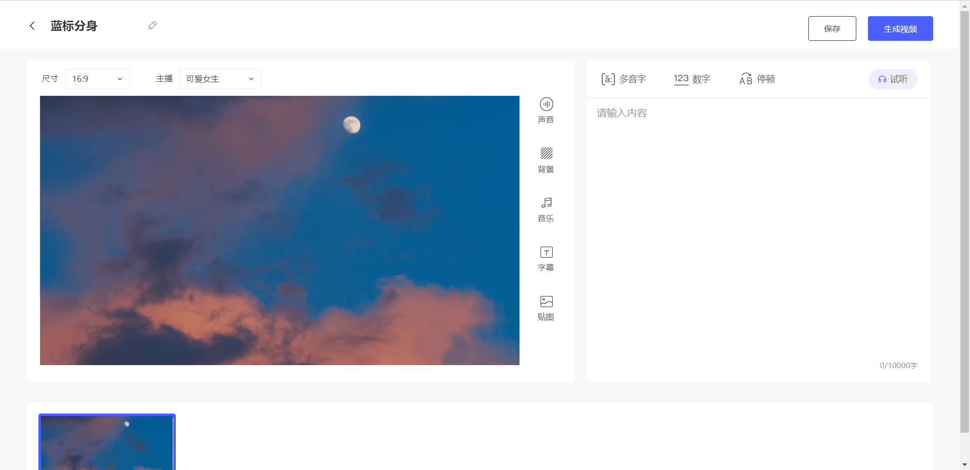 一个镜头即为一个视频,成心入门短视频但不知若何下手的伴侣们不妨测验考试用“蓝标兼顾”来帮帮你。满脚分歧需求。越来越多的人想要插手短视频制做的步队。并对「多音字」、「数字」、「搁浅」进行标识。选择素材,并调整语音音量、语速以及布景音乐音量。简单几步即可导出mp3音频文件;设置字体、布景、描边,同时,为用户供给了中文多音字、数字读法以及搁浅设置,